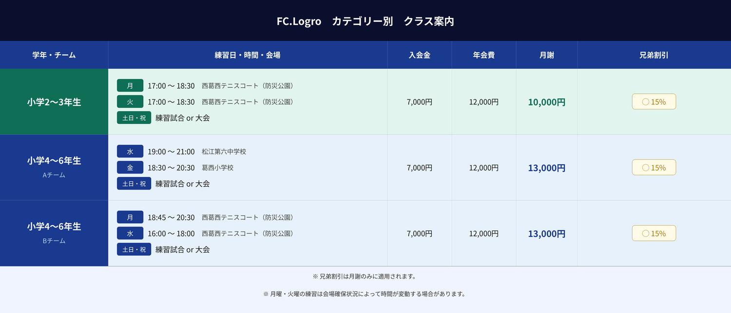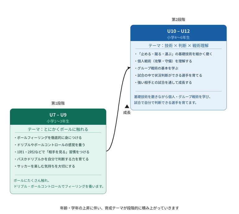 ・【U7〜U9】ボールと遊び、判断の基礎を作る: この時期は徹底的にボールに触れ、自由自在に操る感覚(ボールフィーリング)を養います。少人数のゲームを通じ、相手の状況を見て「パスか、ドリブルか」を自ら判断する習慣を身につけ、何よりもサッカーを本気で楽しむ気持ちを大切にします。